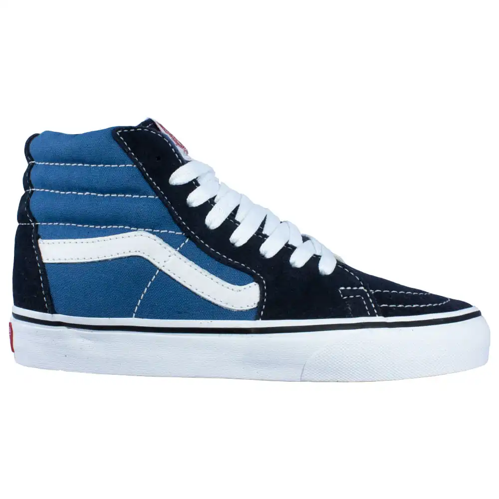 • O Vans SK8 HI Navy tem em seu cabedal camurça azul marinho e com o painel lateral em canvas azul claro.