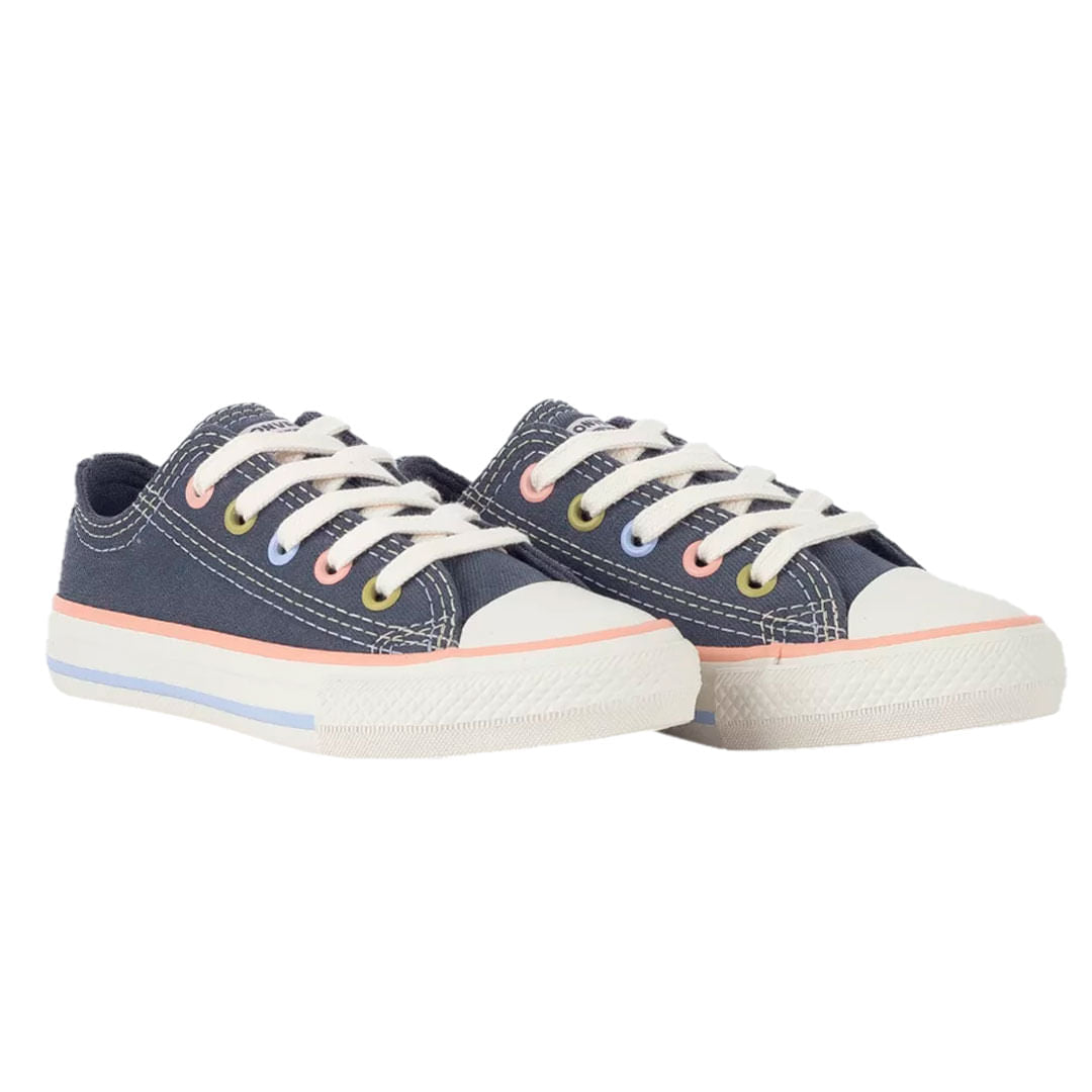 • O clássico Chuck Taylor All Star na versão kids, nesta coleção Vintage Remastered, é confeccionado em lona de algodão, possui costuras duplas, ilhoses na cor prateada, uma tira de tecido no calcanhar que proporciona maior suporte ao tênis, forro interno acolchoado para maior conforto e dois ilhoses laterais para uma transpiração adequada aos pés. O logo com assinatura Converse Chuck Taylor All Star é aplicado na parte interna dos canos, enquanto o logo Converse All Star é aplicado na heeltab do calcanhar. O solado vulcanizado garante a aderência adequada ao caminhar.