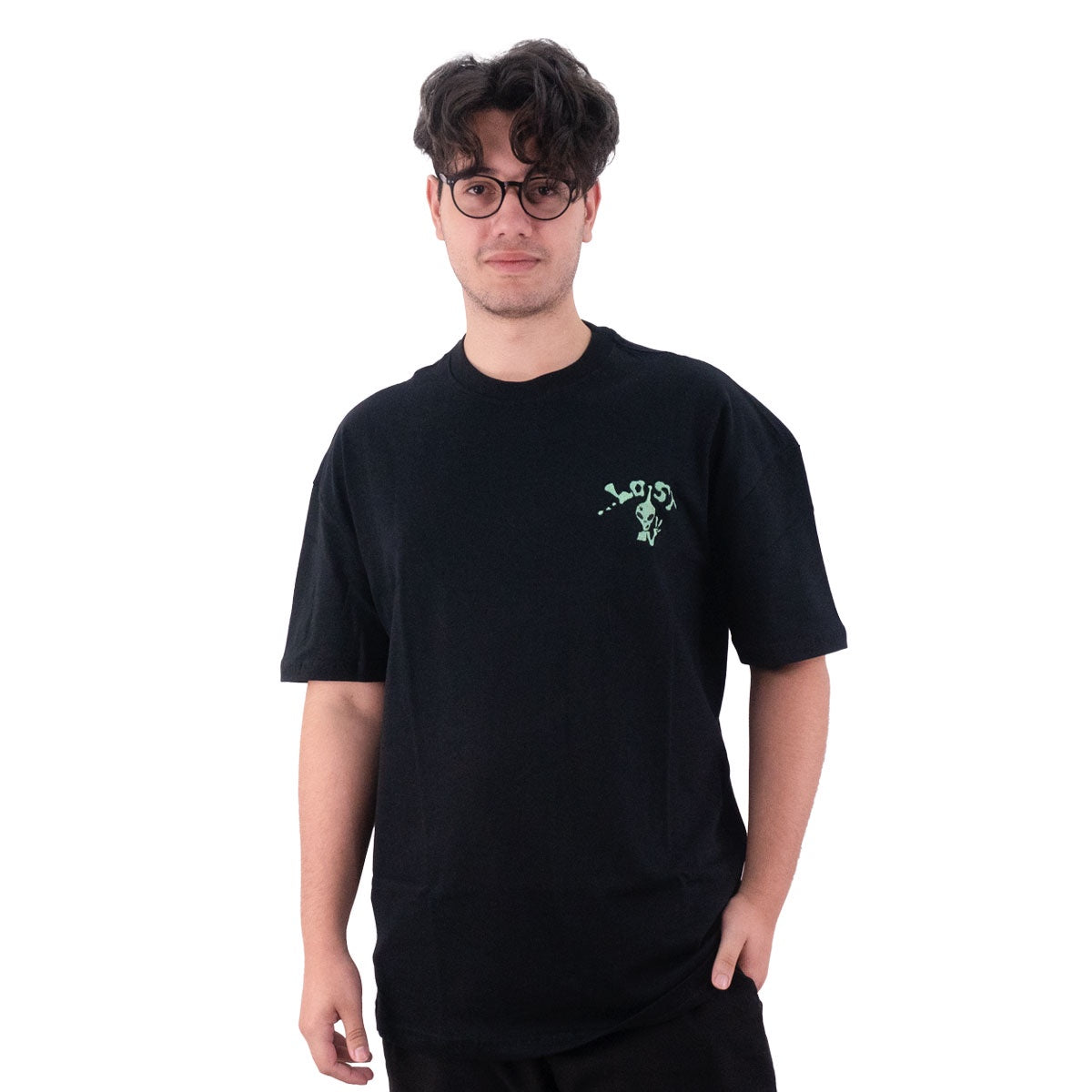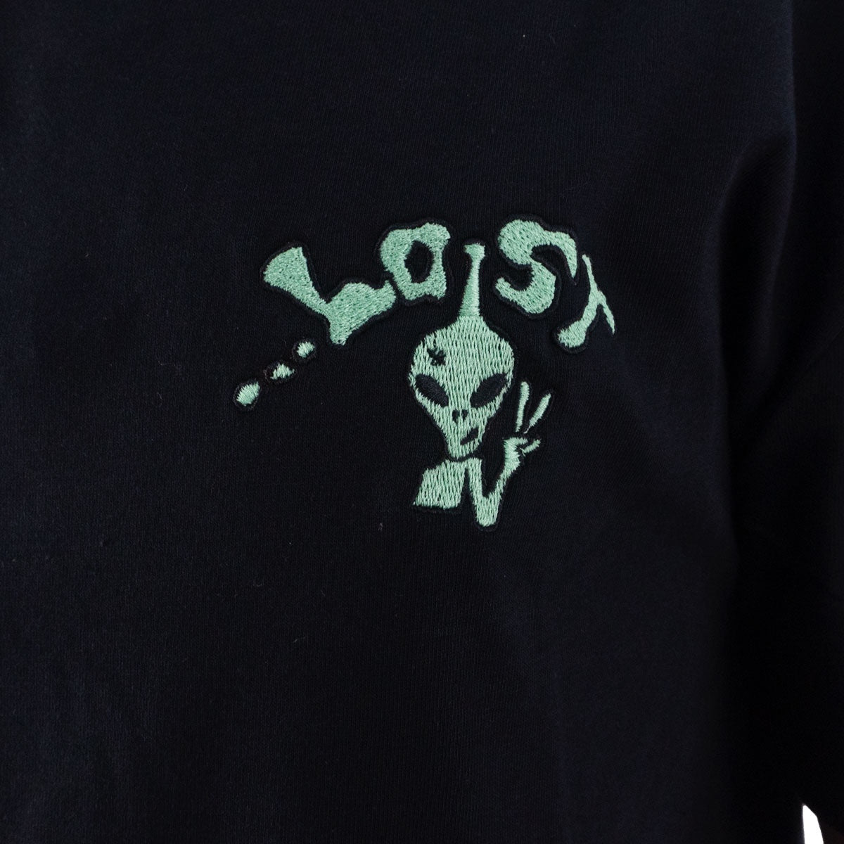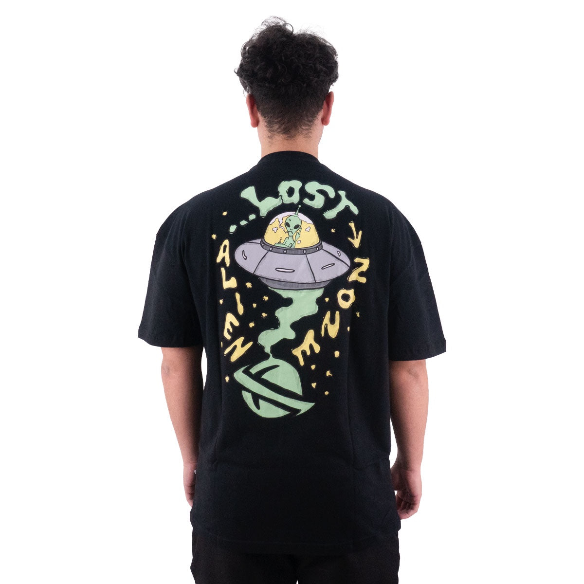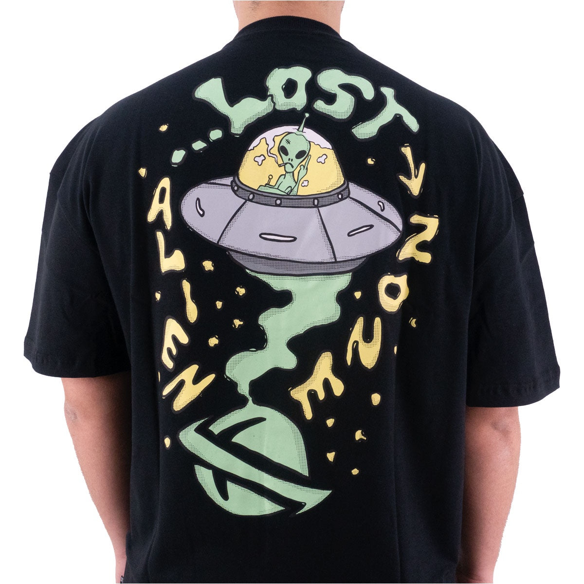• A Camiseta Lost Alien Zone une o streetwear a um visual irreverente, com frente minimalista exibindo o logo \…Lost e um alienígena no peito, e costas marcantes com estampa vibrante de um alien pilotando uma nave espacial.