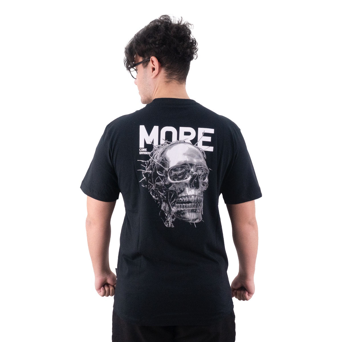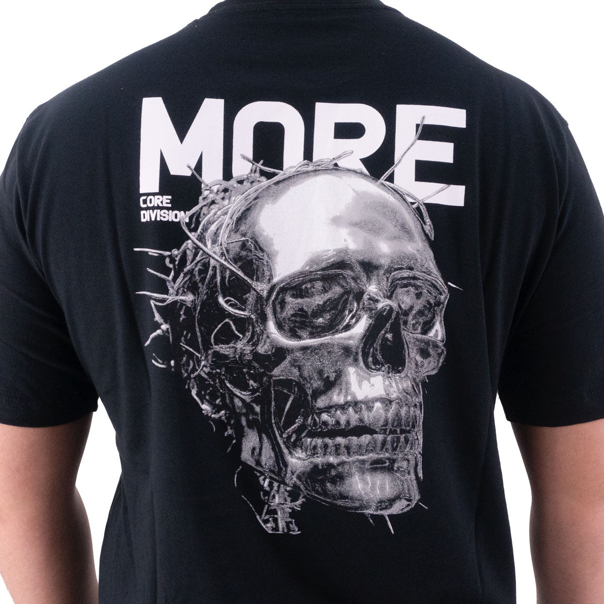 • Impressão em alta definição de uma caveira com coroa de espinhos, acompanhada do lettering “MORE Core Division”, criando um visual imponente e cheio de personalidade.