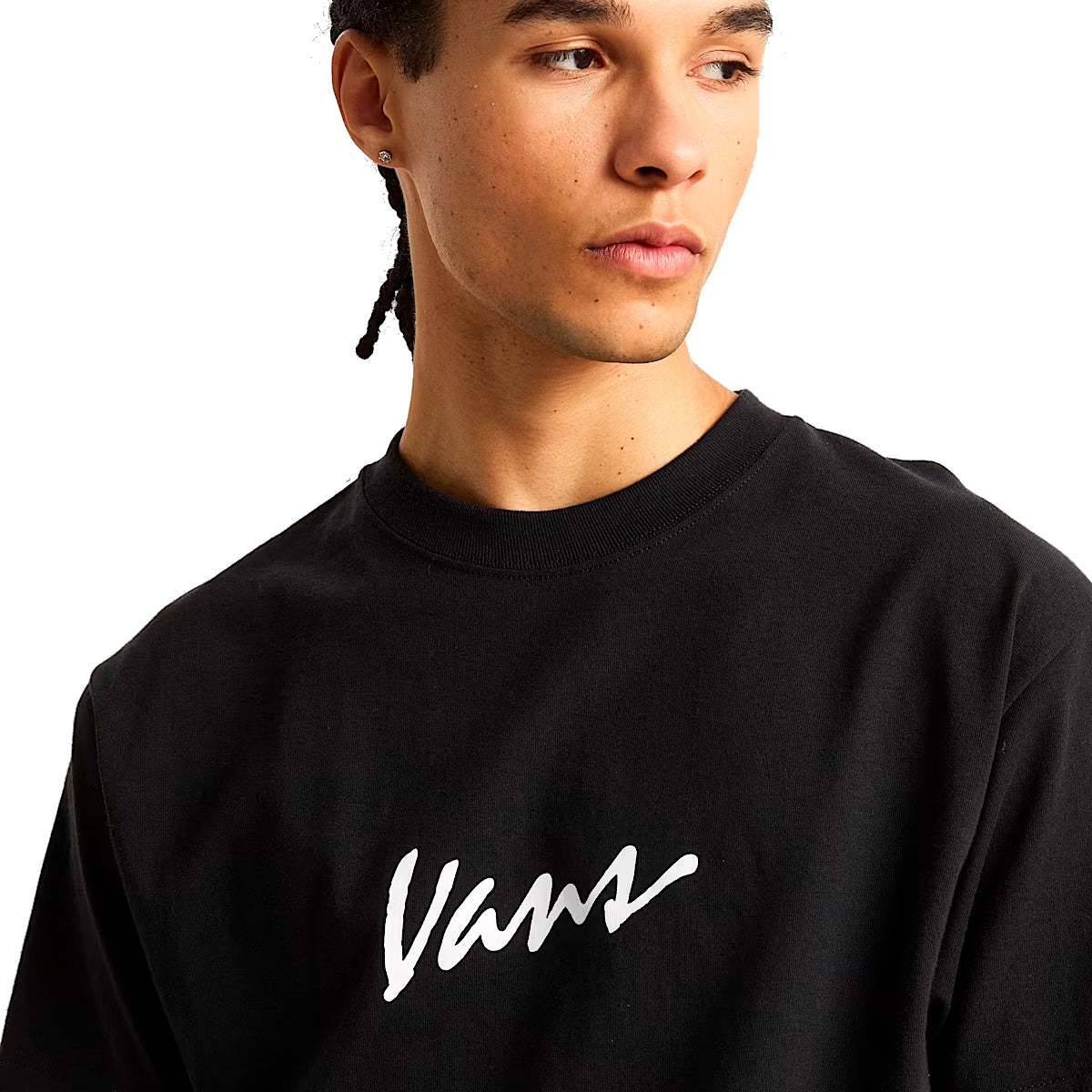 • A estampa frontal em silk à base d’água traz a icônica assinatura Vans em letra cursiva, posicionada de forma diagonal no peito — um detalhe que traduz a identidade original da marca.