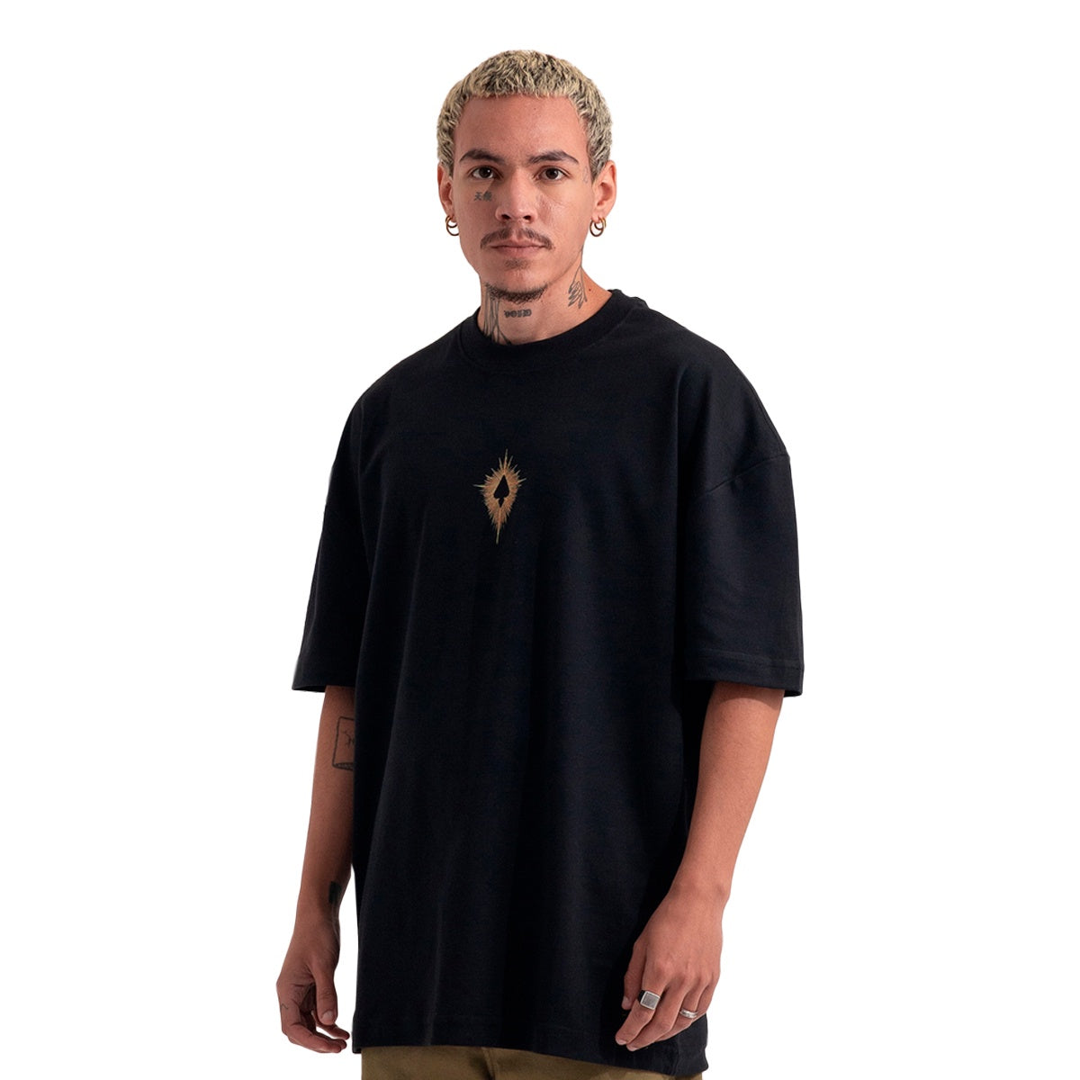 A estampa Espada centralizada no peito reforça a assinatura da marca, enquanto o grande design Guadalupe nas costas transforma a camiseta em uma peça de impacto — perfeita para quem gosta de visual marcante e urbano.